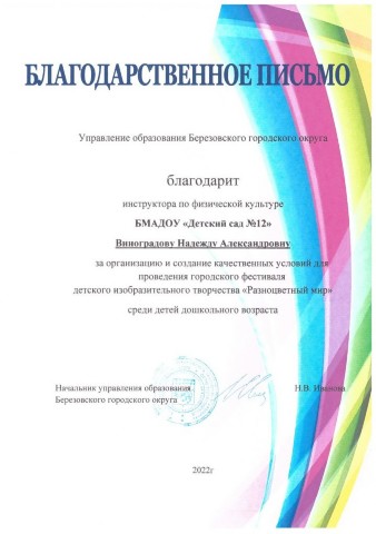 2022 БП УО за организацию и создание качественных условии при проведении городского фестиваля детского творчества "Разноцветный мир"