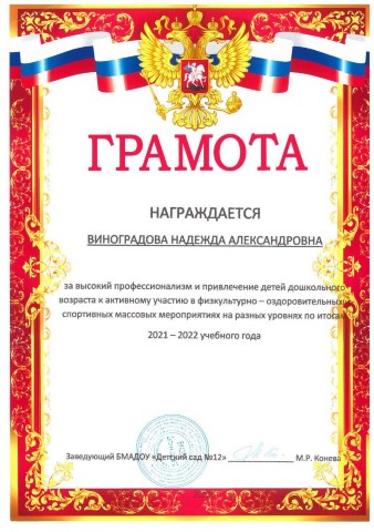 2022г Грамота за высокии профессионализм и привлечение детей дошкольного возраста к активному участию в физкультурно - оздоровительных спортивных массовых мероприятиях на разных уровнях по итогам 2021 - 2022 уч года