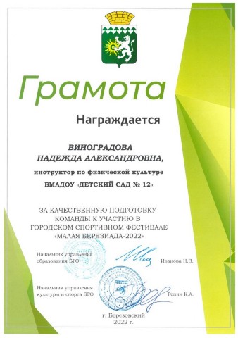 2022г Грамота за качественную подготовку команды к участию в городском спортивном фестивале "Малая Березиада - 2022"