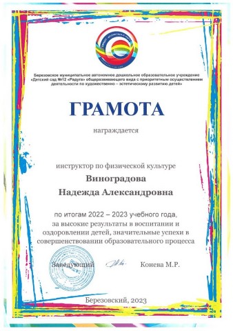 2023г Грамота по итогам 2022-2023 учебного года, за высокие результаты в воспитании и оздоровлении детей,значительные успехи в совершенствовании образовательного процесса