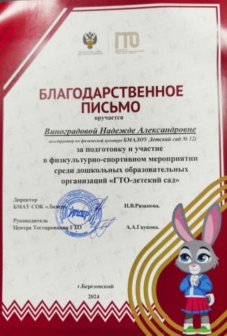 2024 Благодарственное письмо за подготовку и участие в физкультурно - спортивном мероприятии среди ДОО "ГТО-детский сад"