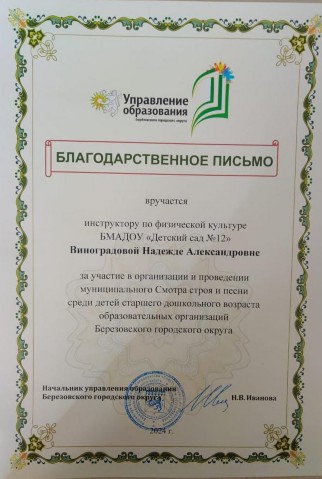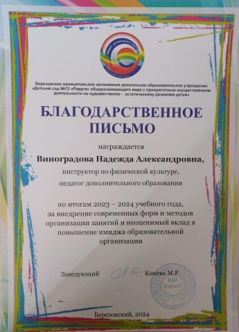 2024 Благодарственное письмо БМАДОУ «Детский сад №12» по итогам 2023-2024 учебного года, за внедрение современных форм и методов организации занятий и неоценимый вклад в повышение имиджа образовательной организации