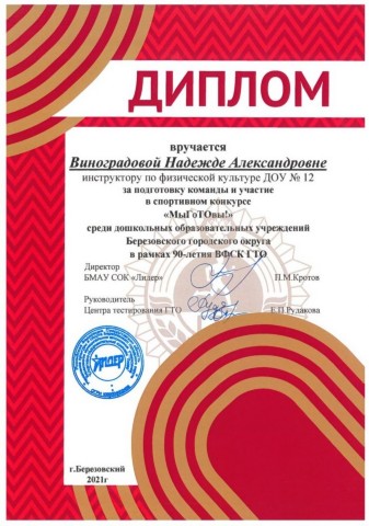 2021г Диплом за подготовку команды и участие в спортивном конкурсе "Мы ГоТОвы!" среди дошкольных образовательных учреждений БГО