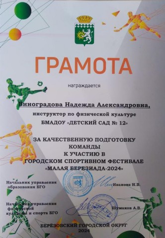 2023 Грамота управления культуры и спорта БГО за качественную подготовку команды к участию в городском спортивном фестивале «Малая Березиада — 2023»