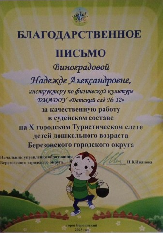 2024 Благодарственное письмо БМАДОУ «Детский сад №12» по итогам 2023-2024 учебного года, за внедрение современных форм и методов организации занятий и неоценимый вклад в повышение имиджа образовательной организации