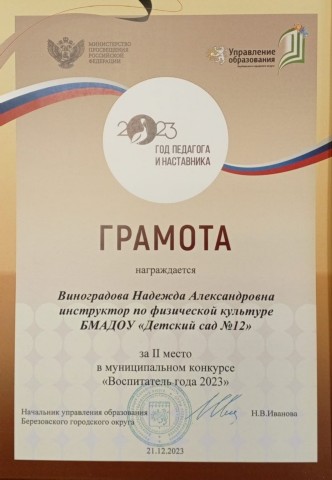 2023 Грамота УО за II место в муниципальном конкурсе «Воспитатель года 2023»