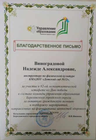 2024 БП УО за участие в 82-ой легкоатлетической эстафете ко Дню Победы в составе команды управления образования БГО, за активную гражданскую позицию и поддержку мероприятий, направленных на формирование ценностей здорового образа жизни